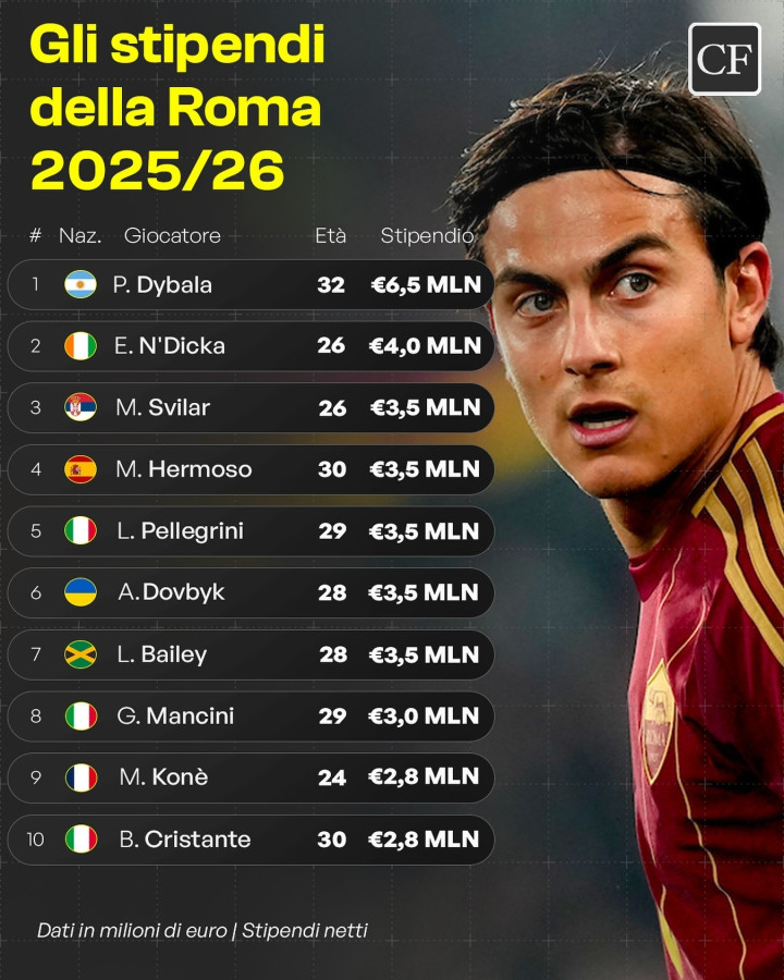 一个夏窗,一个冬窗,如故能看出来,白头翁加公如斯合适罗马的东谈主,依然语言份量不够。一谈来看下,罗马本赛季球队主要球员薪资一览表,总薪水为6090万欧,税前约1.075亿欧,比上赛季增长了20%。迪巴拉是650万欧元年薪加150万欧元奖金,佩莱格里尼是350万欧元年薪加200万欧元奖金。也就是说这两个病号,小魔仙一个东谈主顶三个,小猪佩奇一个东谈主顶两个。而金雇主如故明确条目,将来引援工资基准和球队续约工资基准,必须把戒指本钱放在更关键的位置。